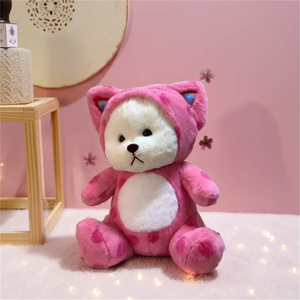 Made from ultra-soft plush fabric and filled with fluffy stuffing, this teddy combines classic cuddliness with a trendy twist. Whether you’re gifting it to someone special or treating yourself, this pink-hooded bear is sure to become a favorite companion for snuggles and smiles.